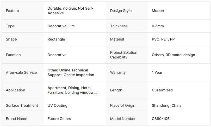 Modern Solid Color Blister Film er et dekorativt filmmateriale som bruker høy molekylær plast som basismateriale. Etter fargelegging og beleggbehandling oppnår den vedheft gjennom "blemmeprosessen" (vakuumadsorpsjonsstøping). Den har "ensartet farge, sterk plastisitet og høy kostnadseffektivitet", og er mye brukt i felt som møbler, dekorasjon og emballasje. Det er et av de ofte brukte materialene i moderne design av minimalistisk stil.